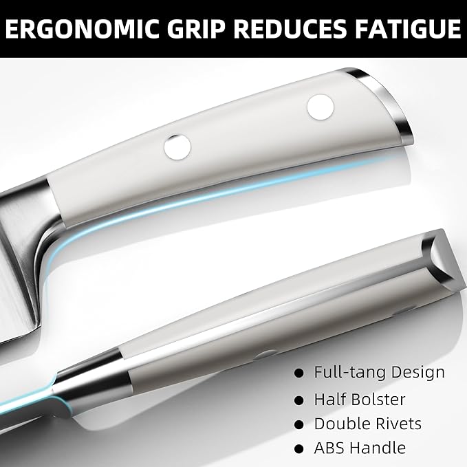 - 【Ergonomic Design】Crafted for comfort, this knife features an ergonomic design and premium handle for a fatigue-free grip. The full tang and half-bolster provide stability, allowing extended periods of effortless cutting.