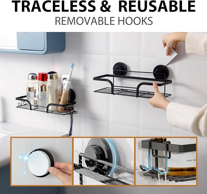 - One Second Installation & Remove: No drilling, no glue, no tools and no need to wait to apply the shower caddy. Simply choose a smooth and dry surface without any grout, take off the protective cover and push the board "PUSH" STRONGLY until you hear "PUFF", ONE second to complete the installation. The suction cup is removable without leaving any marks, so you can adjust height and position whenever you want