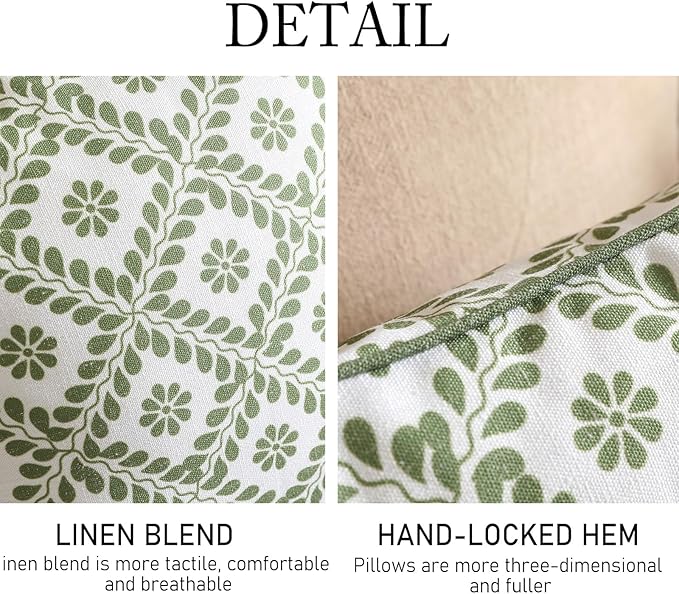Design Fresh Linen Square Throw Pillow Covers 18"x18" Pack of 2, French White Cottage Cushion Covers with Green Branches Pattern Decoration Pillowcases for Bed,Living Room,Outdoor,Car