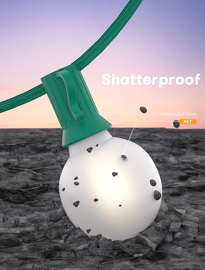 - Shatterproof and Energy Saving: The G40 string light is made of high-quality shatterproof material that can withstand accidental drops and impacts. Each 0.6W LED bulb saves more than 85% energy than incandescent bulbs. G40 globe christmas lights have a service life of up to 20,000 hours, which can reduce the cost of frequent bulb replacement. 25ft shatterproof outdoor christmas string lights are great mood lighting for apartments, patios, decks, weddings, parties, umbrellas, backyards, pergolas and more