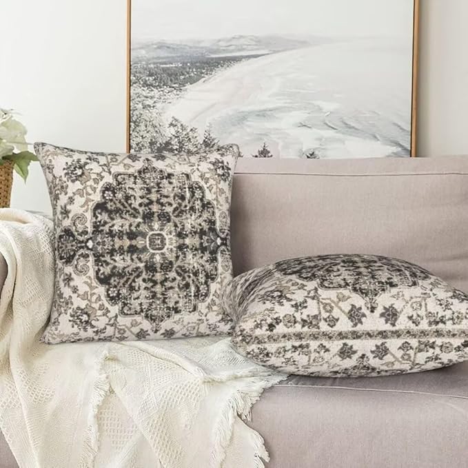 Boho Throw Pillow Covers 22x22 Set of 2, Black Brown Carpet Pattern Pillow Covers Ethnic Rustic Farmhouse Cushion Cases Linen Decorative Gifts for Couch Sofa Indoor Outdoor