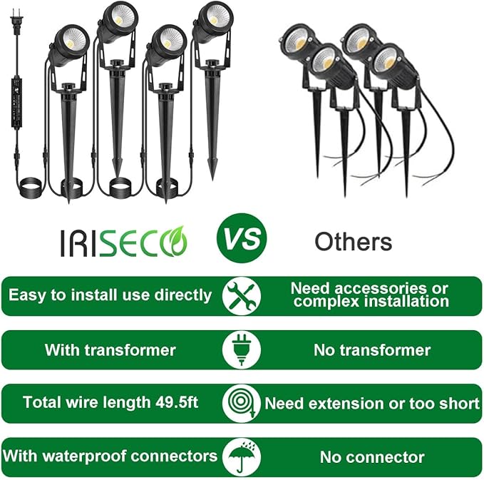 - 【Integrated LED Landscape Lighting】-IRISECO outdoor spot lights use high-quality LED chips provide warm white light, upgraded lens makes the light well-balanced and glare-free without impact on eyes. They offer higher brightness and a longer lifespan (up to 25,000 hours), the 300 lm per outdoor uplights are perfect for illuminating your patio, garden paths, and backyard fences.