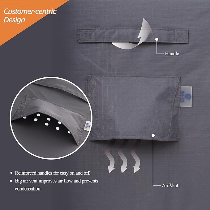 - ✓ Easy to Use: Durable medium weight cover with two reinforced handles make it easy to put on and take off. Two air vents reduce inside condensation and wind lofting. The cover can be put away in its own storage bag when not in use.