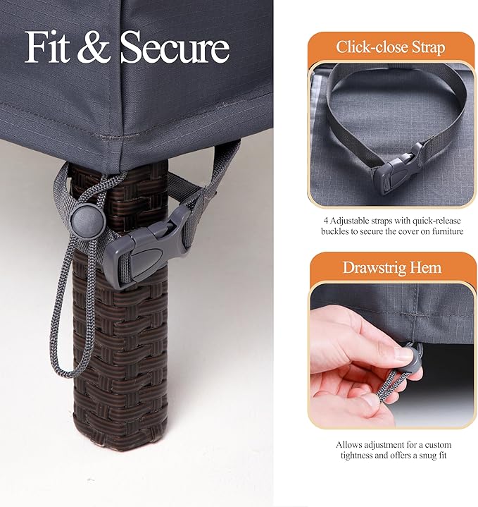 - ✓ Fit & Secure: Tie it down with the click-close straps at the corners & drawstrings at the hem. They ensure a tight fit, prevent the cover from getting torn, and keep the cover in place.
