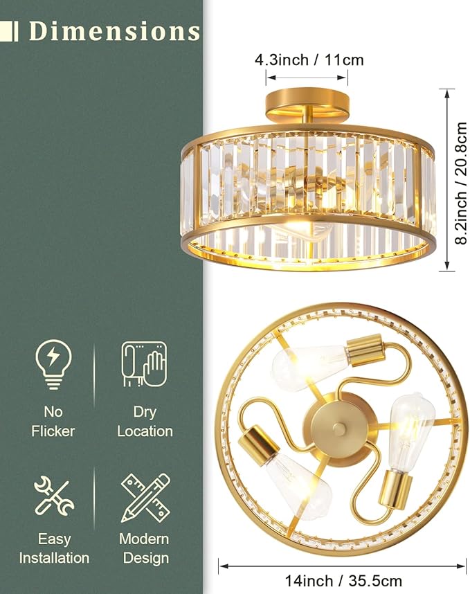 - 【Small Light Fixtures Ceiling Mount】- Size is: D*W*H, small size is suitable for low ceilings and corridors and porches; using high-quality clear K9 crystal rods, each crystal prism rod is well connected with the metal frame, don't worry easy broken or dropped;
