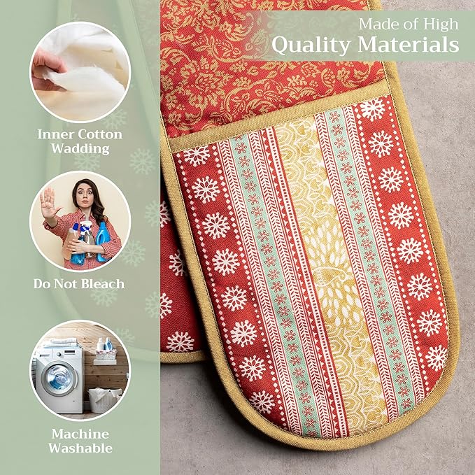 - Premium Quality: Crafted from quilted 100% cotton, this heat-resistant double oven mitt protects your hands and forearms from hot cookware. It features a built-in hanging loop for easy storage and quick access. This versatile set is perfect for everyday home kitchens, farmhouse kitchens, hotels, restaurants, and bakeries