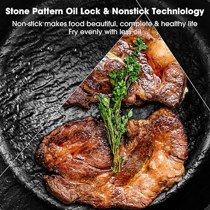 - Oven Safe & Perfect Gift - Cook with confidence as the nonstick frying pans can safely withstand temperatures up to 464°F. Oven-safe up to 320 degrees F. The ability to heat evenly in the oven and not easily deformed makes the food baked in the nonstick pan even more delicious. Will be an awesome idea for Valentines day gifts, Fathers day gifts, birthday gifts, Wedding gifts for couples, Housewarming gifts for new house