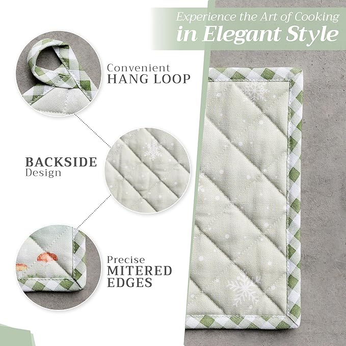 - Premium Quality: Crafted from quilted 100% cotton, this heat-resistant oven mitt and pot holder set protects your hands from hot cookware. Each piece features a built-in hanging loop for easy storage and quick access. This versatile set is perfect for everyday home kitchens, farmhouse kitchens, hotels, restaurants, and bakeries