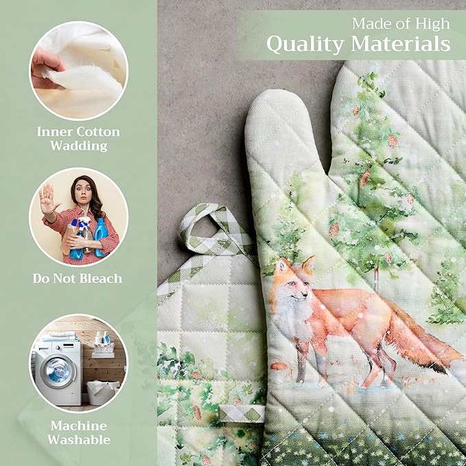 Maison d' Hermine 100% Cotton Oven Mitt & Pot Holder Set (7.5"x13" & 8"x8") Heat Resistant BBQ Cooking Gloves with Loop for Thanksgiving Christmas Decorations Handling Hot Pans (Winter Mornings)
