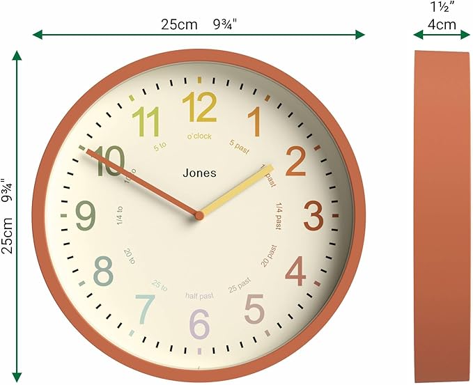 JONES CLOCKS® Kids Wall Clock | Small Modern Children’s Clock | 10 inch | Terracotta Orange | Colourful Numbers | Learn to Tell The time
