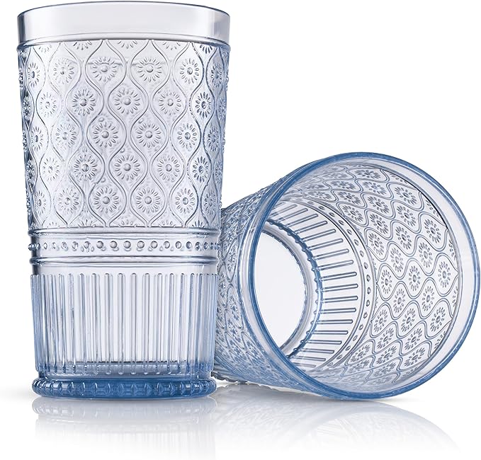 Godinger Highball Drinking Glasses, Acrylic Drinking Glasses Set, Elegant Tall Plastic Cups, Vintage Romantic Decor - Set of 4, Blue