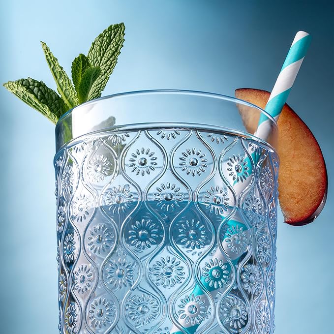 - Claro collection vintage romantic design crystal look-alike acrylic tall drinking glasses are ideal for indoor or outdoor picnic and party use.