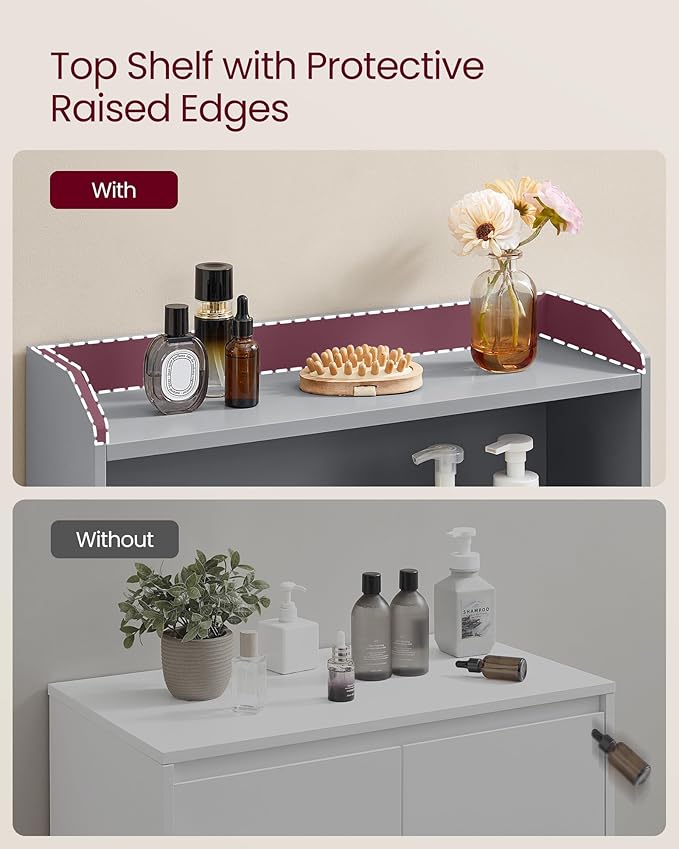 - 【SAFE AND STABLE】The raised edges on the top of this freestanding bathroom cabinet prevent items from falling off, and the included anti-tip kit helps secure the cabinet to the wall for added stability and safety
