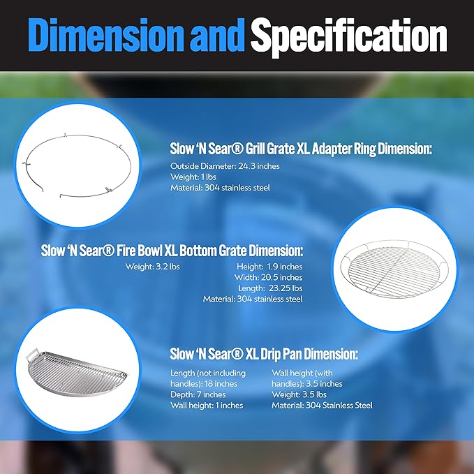 - Complete Grilling Solution: This comprehensive system includes a Slow ‘n Sear Insert, EasySpin Grill Grate, Grill Grate Adapter Ring, Fire Bowl Bottom Grate, and a Drip Pan, all engineered for the perfect fit and ultimate cooking versatility.