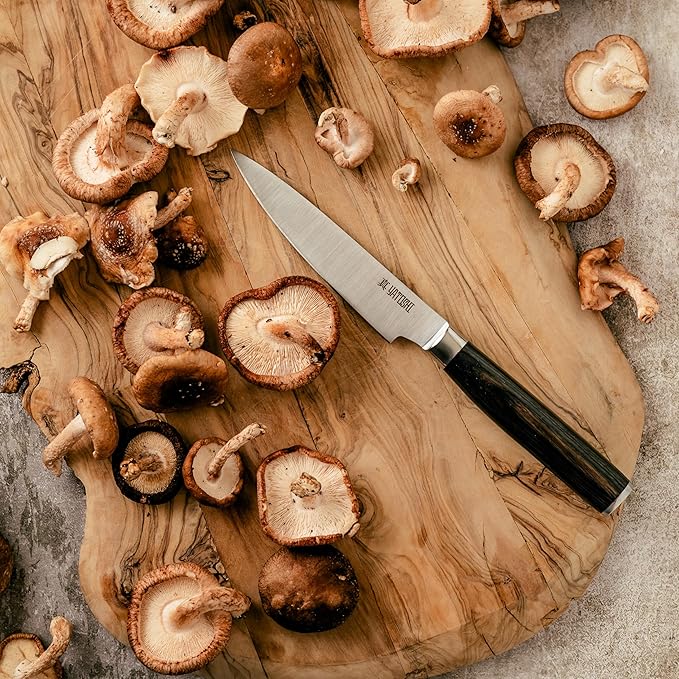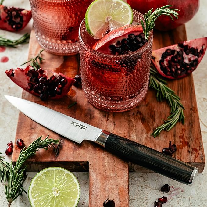 - High Carbon Blades: Made with premium 7Cr17 High Carbon Steel, which provides a razor-sharp, professional-quality blade. The steel contains 0.6-0.75 carbon, making it two times tougher than other knives in its class with a Rockwell Hardness of 57-58.