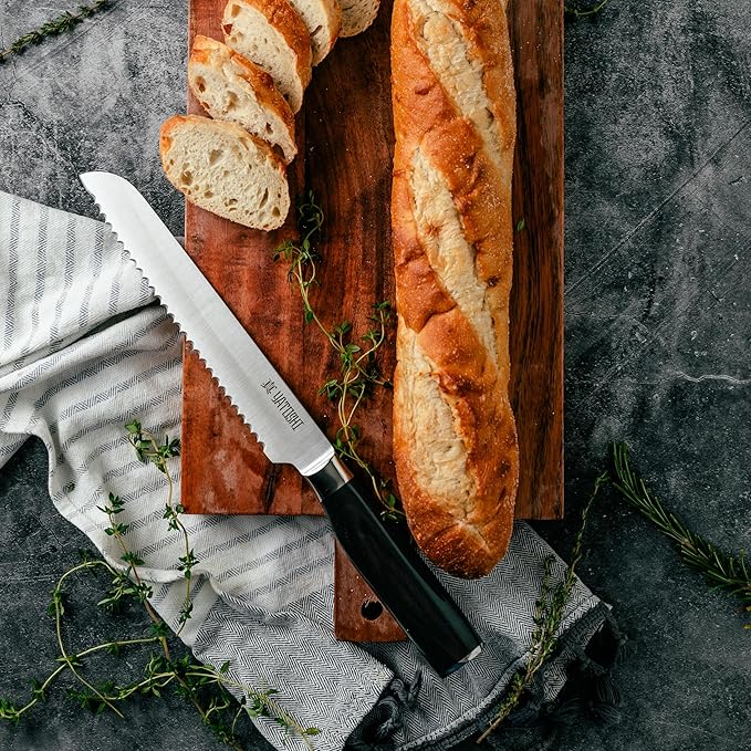 - Set Includes: 1x 8β Chefβs Knife, 1x 8β Bread Knife, 1x 8β Slicing Knife, 1x 5β Santoku Knife, 1x 5β Utility Knife, 1x 3.5β Paring Knife, 1x 8β Honing Steel