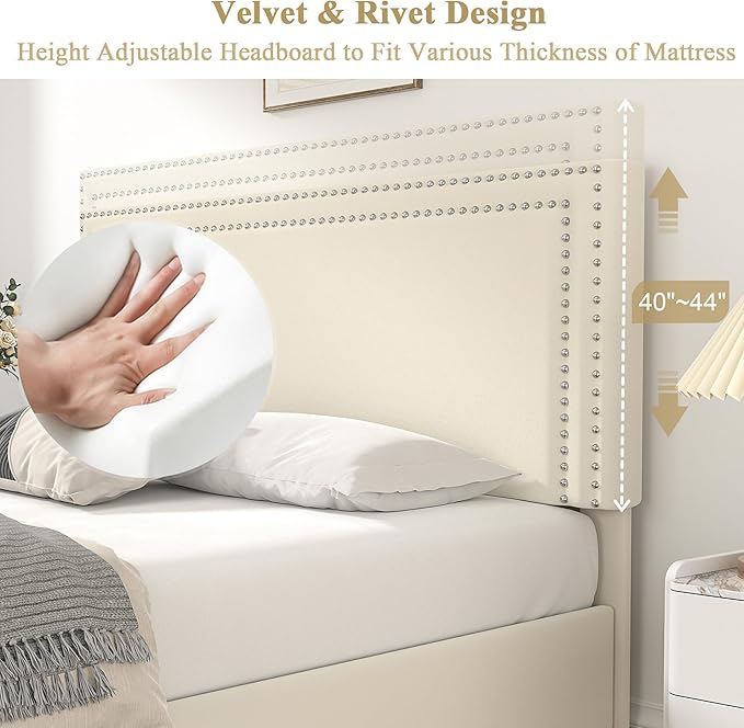 - [Adjustable Velvet Upholstered Headboard]--Featuring a stylish rivet trim, the headboard can be easily adjusted to three different heights - 40.1/42.1/44.1 inches - to perfectly fit up to 12 inch mattress. Wrapped in plush velvet and padded with a high-resilience sponge, this comfortable headboard provides a cozy and supportive surface for relaxing while reading or watching TV in bed.