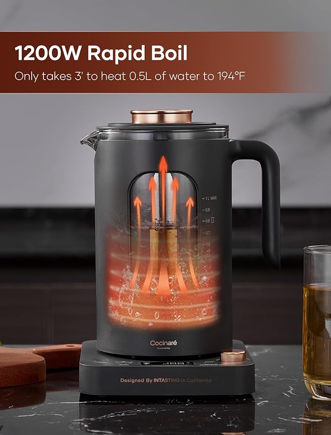 - Multi-Functional Design: This electric kettle provides precise temperature control, making it perfect for boiling water, flower tea, black tea, green tea, coffee, and more. Each temperature can be easily selected using a knob, ensuring precise temperature control accurate to 1 degree. It also features a built-in tea infuser for quick and convenient tea brewing.