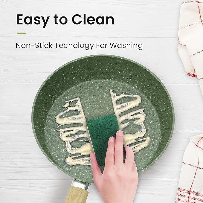 - 𝐄𝐚𝐬𝐲 𝐭𝐨 𝐂𝐥𝐞𝐚𝐧: Say goodbye to scrubbing and soaking. Our non stick pots and pan set features a smooth, easy-to-clean surface, ensuring that tidying up is as simple as enjoying your delicious creations. Easy to clean granite cookware set