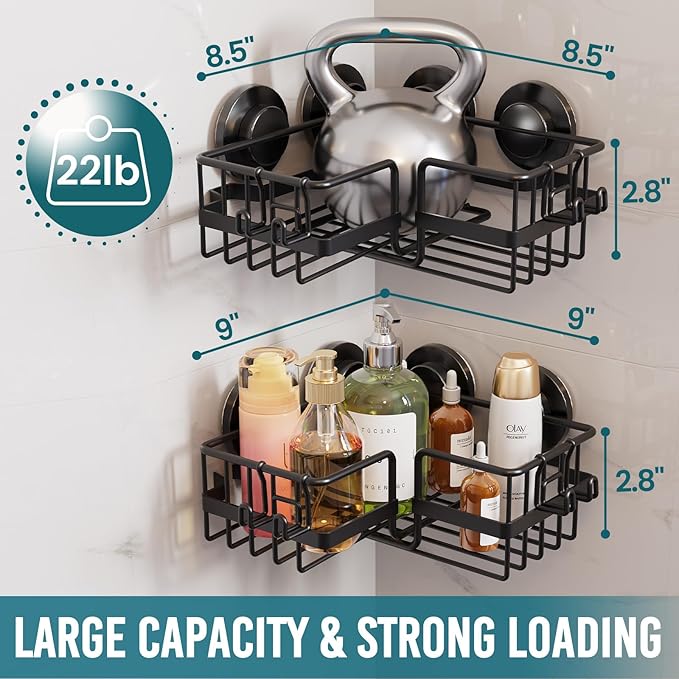 - Multifunctional: The shower caddy with suction cups is perfect for bathroom and kitchen storage, such as hand sanitizer, disinfectant cleaner, shampoo, conditioner, body wash, cleanser, kitchen utensils, etc., anywhere you need to organize storage. Each corner basket shelf has 2 hooks to organize loofahs, shower brushes and other bath products