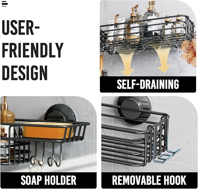 - Rustproof & Fast Draining: Shower shelves for inside shower is made of Stainless Steel which not only prevents rust but also stands up to times. Whit all-around drainage design, the black shower caddy has maximum air ventilation and water dripping away. Keep your bath products air dry quickly and clean