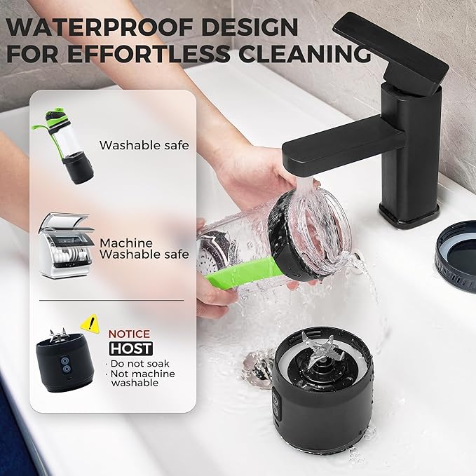 - Waterproof Construction for Easy Cleaning: The entire unit, including the base, is washable with water, although prolonged immersion is not recommended. Additionally, a 30-second blending cycle with water and a drop of dish soap ensures self-cleaning functionality. Most components, excluding the base, are also dishwasher safe for added convenience.