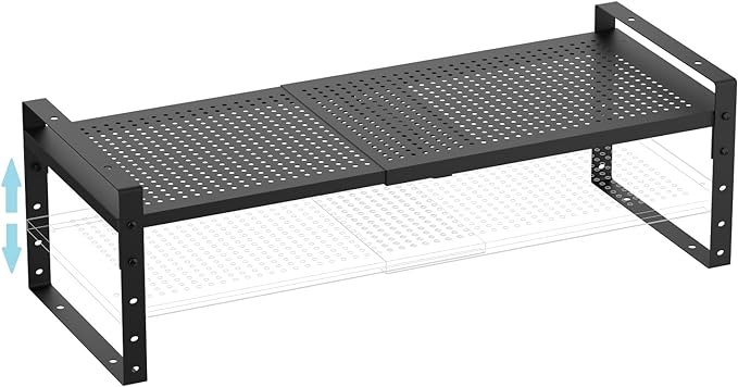 - ⭐【Expandable & Stackable Cabinet Organizer】This cabinet shelf is expandable, allowing you to adjust the width and height to suit your needs.The measures are 10.24"Dx16.54~27.17"Wx2.17~7.88"H.There are 5holes for each side which can be adjusted the width from 16.54" to 27.17".It also can be easily stacked up to a 2 or 3 tier kitchen organizer.