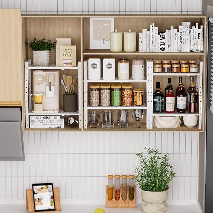 - ⭐【Versatile Spice Shelf for Cabinet】This adjustable kitchen counter stand shelf instantly create additional storage space.It is very helpful to organize the Bottles, Cans, Bowls, Plates, Pans, Soup pots in kitchen,Pantry and cupboard.Also a great space-saving option for the bedroom, study, sitting room, bathroom, and more.In particular, our larger sizes can be used as shoe racks alone.