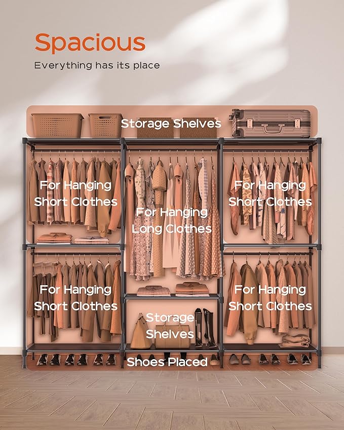 - [Easy to Installation] This clothes storage organizer comes with detailed installation instructions, no tools required. Simply connect the tubes and fabric shelves using the plastic connectors, and that's it! Your clothes rack is assembled in a breeze.