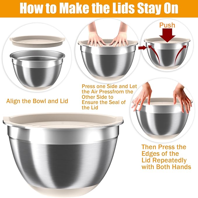 - 【Sealed Lid & Non-Slip Silicone Bottom】: The food storage container set has BPA-free plastic lid to store ingredients, locking in freshness without worrying about spills or leaks. The stainless mixing bowl set has a non-slip silicone base, preventing the nesting mixing bowls with lids from sliding on the countertop while mixing, and the scald-proof insulation protects the table from high temperatures.