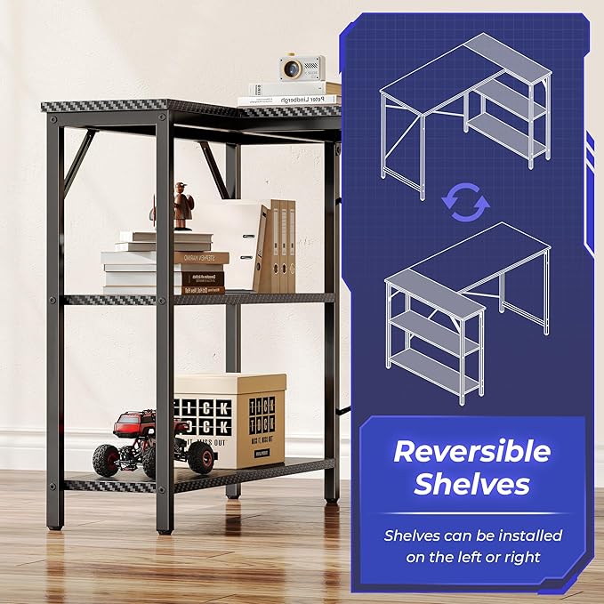 Huuger L Shaped Desk, 47 Inch Gaming & Home Office Desk with Reversible Storage Shelves, Metal Frame, Carbon Fiber Black