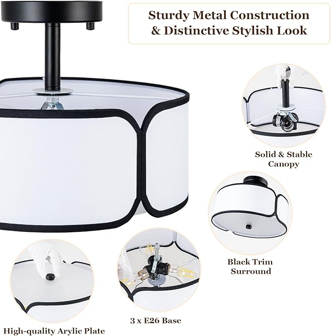 - 【Bulb Requirement】The 3-light setup offers versatility in directing and concentrating light, maximizing brightness to illuminate your abode. This semi flush mount light is compatible with 3 x E26 base bulbs, encompassing LED, CFL, incandescent, and halogen options. Additionally, it boasts dimmability when paired with a compatible bulb and dimmer switch. Customize the ambiance by selecting diverse bulb styles and color temperatures. [Please note: Bulb and dimmer switch are not included.]