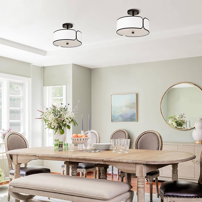 - 【Set of 2 & Distinctive Design】 This 12.6 inches semi flush mount ceiling light is designed with a sturdy metal construction in a polished black shade that harmonizes with a variety of interior styles. The drum bedroom light's fabric shade is a pure white color that effectively diffuses light to protect your eyesight. Luild flush mount ceiling light has a linen look and feel to it. Together, the sleek metal shade and alluring hardback fabric shade create an enchanting atmosphere of sophistication and subtle elegance, providing a refined ambiance to any setting.