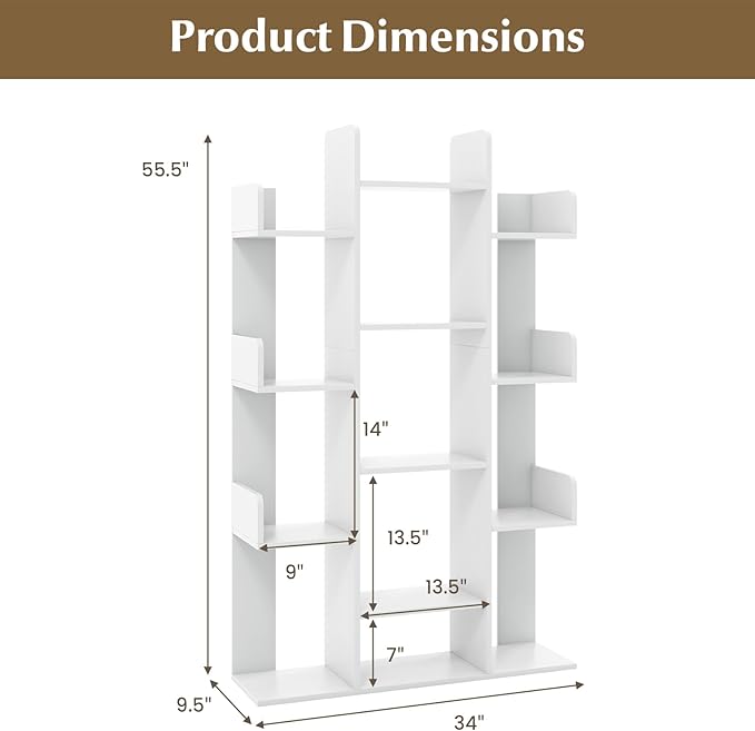 - Sufficient Storage Space: Measuring 55.5” tall, this bookshelf with 13 open shelves offers ample storage space for multiple items like books, photo frames, potted plants, toys, decorations and so on. Product Dimension: 34” x 9.5” x 55.5” (L x W x H)