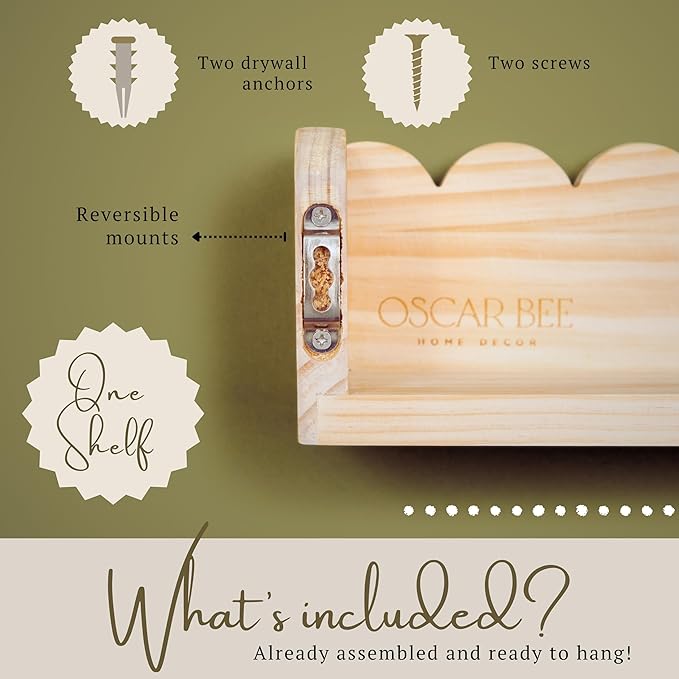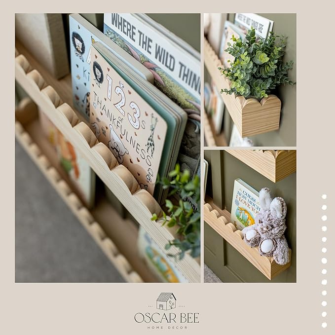 - 𝗖𝗵𝗶𝗹𝗱-𝗦𝗮𝗳𝗲 𝗦𝘁𝗼𝗿𝗮𝗴𝗲: Keep your child's books organized and tidy with the Oscar Bee 34-inch floating shelves for walls. Designed with taller edges and durable wall mounts, these book shelves provide a safe and sturdy solution, able to withstand the lively play of toddlers while keeping books organized