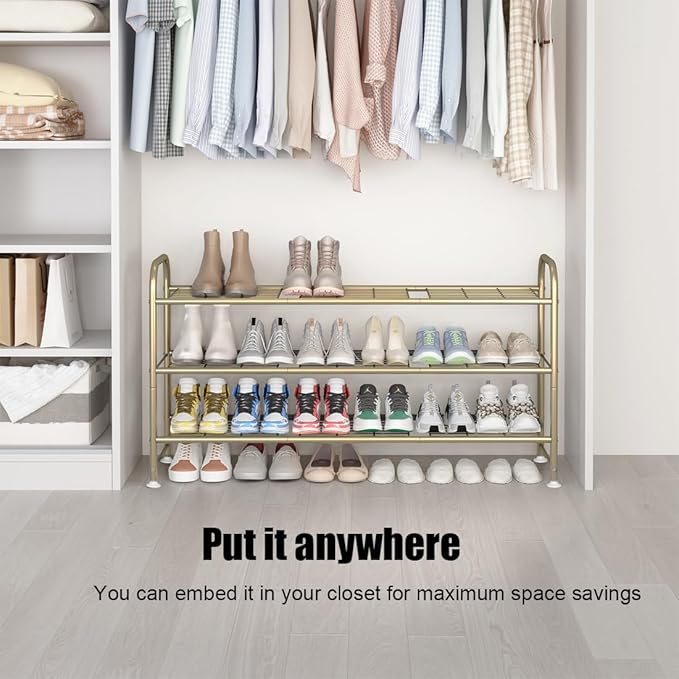 LINZINAR Shoe Rack Long 3 Tier Shoe Storage Organizer Metal Wide Shoe Shelf for Closet Entryway Bedroom 24 Paris Large Capacity, Gold