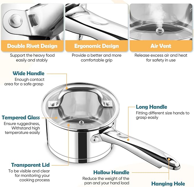 - 【Thoughtful User-Centric Design】1 qt sauce pan has one ergonomic pot handle and wide lid handle to provide a comfortable gripping, The long and hollow pot handle allows different sizes of the hand to grasp firmly and lighten your hand load, Faster dissipate heat than the solid pot handle, Lid with a vent is used for releasing excess air and heat from the pot for safety use, Transparent cover making you clearly see the progress of cooking