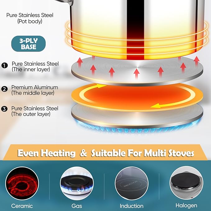 - 【Tri-ply Base for Multi Stoves】The pot bottom with 3-Ply constructions, Pure stainless steel of outer and inner layers for rust-proof and longtime use, Core aluminium is to conduct heat faster and more even (this layer will not contact your food ), And straight side helps to increase the bottom area which is equal to heating surface, To reduce your cooking time and save energy, Making your pan work with many stovetops effectively, such as induction, gas, electric and ceramic stove etc, Say goodbye to the limitations of traditional pot
