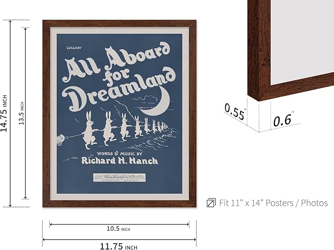 Poster Master All Aboard For Dreamland Poster - Retro Children's Lullaby Print - Story Book Art - Bunny Art - Rabbit Art - Aesthetic Art - Kid's Bedroom or Nursery Wall Decor, 11x14 Brown Framed