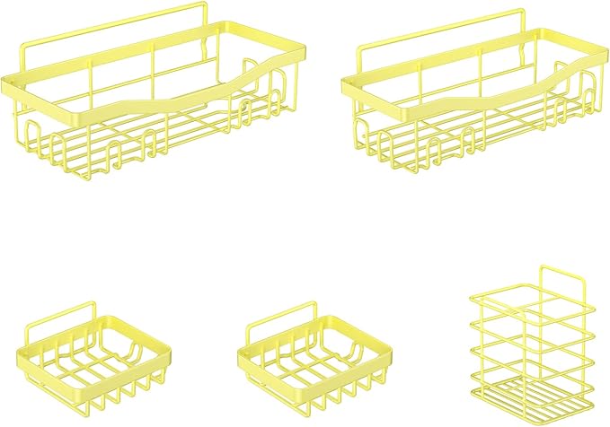 Adhesive Shower Caddy, No Drilling Bath Organizers 5 Pack, Rustproof Shelves with Soap Holder & Toothbrush Holder, Bathroom Organizers and Storage, Yellow