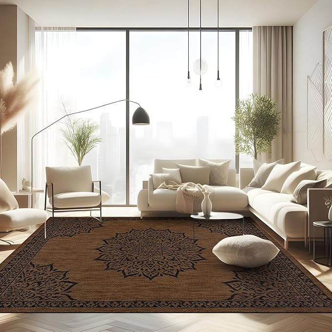 CAMILSON Outdoor Rug, 10x14 Medallion Nut Brown Black Modern Area Rugs for Large Indoor and Outdoor Patios, Kitchen and Hallway Mats, Washable Porch Deck Outside Carpet (Nut Brown Black, 10 x 14)