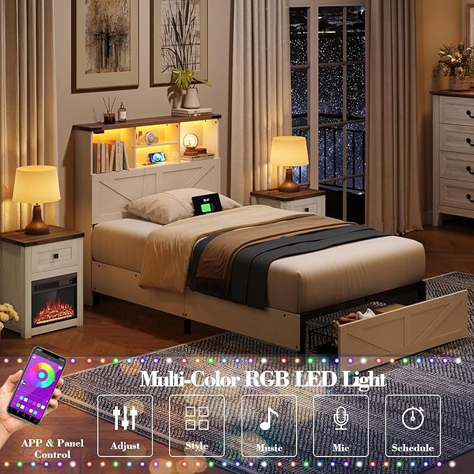 Twin Bed Frame with Bookshelf, Bookcase High Headboard with Charging Station and LED Light, Farmhouse Bed with Storage Drawers, No Box Spring Needed, Noise Free, Easy Assembly, Antique White