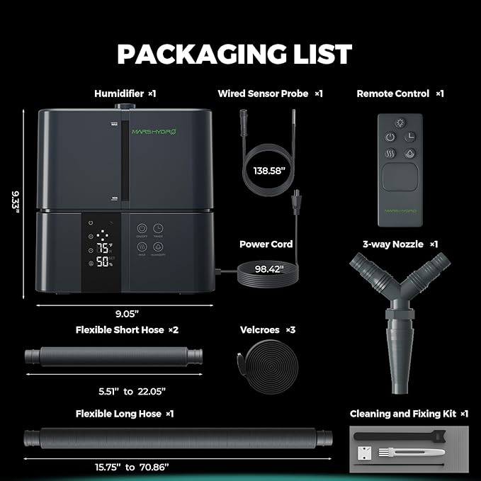 - Adjustable Humidity Levels:Customize and maintain the ideal humidity level for your plants. It offers 1-4 levels of fog volume and 35%-95% humidity adjustment.Flexible telescopic hoses ensure precise humidity distribution for specific areas or the entire grow space.