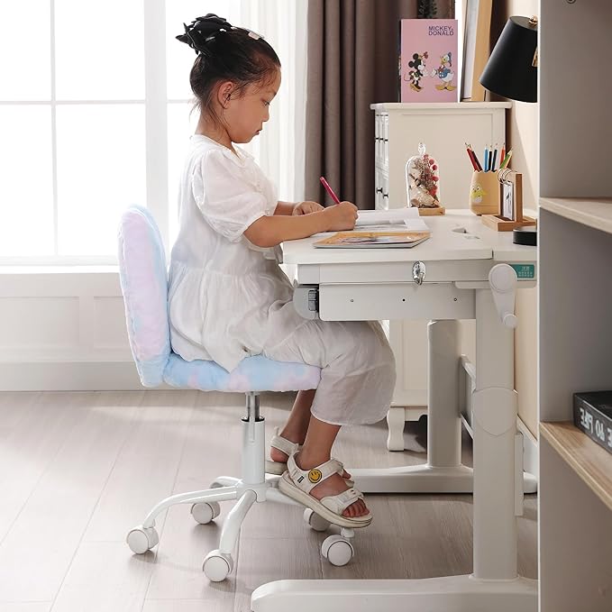 Cute Fuzzy Kids Chair for Children Rolling Study Desk Student Chair for Child Furry Computer Task Chair, Adjustable Heart Shaped Reading Desk Chairs for Bedroom Study,Babay Blue