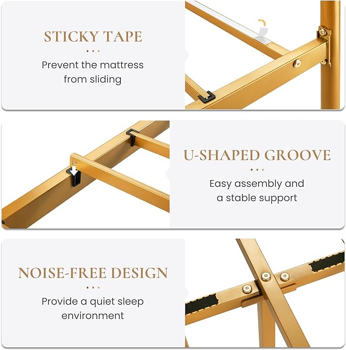 - Noise-Free: The gold bed frame provides an EVA sponge to help cushion the contact between slats and reduce potential noise caused by friction. Greatly improve the quality of sleep by minimizing disturbances from creaking or rattling sounds