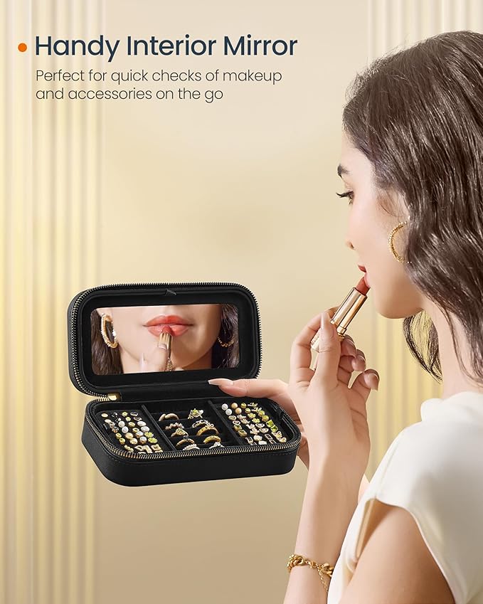 - 【COMPACT AND TRAVEL-READY】Travel in style with our portable jewelry box, a compact 4.1"D x 8"W x 2.4"H size that effortlessly fits into your bag or suitcase. Complete with an independent mirror for quick makeup checks and smooth zippers for easy access