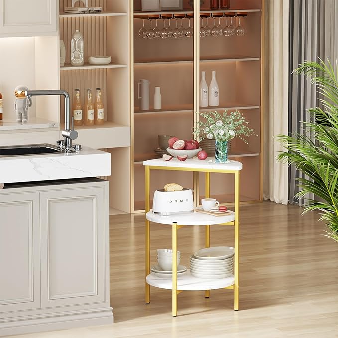 AWQM Marble Side End Table, 3-Tier Sofa Side Table,Small Round Coffee Table Bedside Table, Corner Table w/Metal Frame for Living Room Bedroom, White+Gold