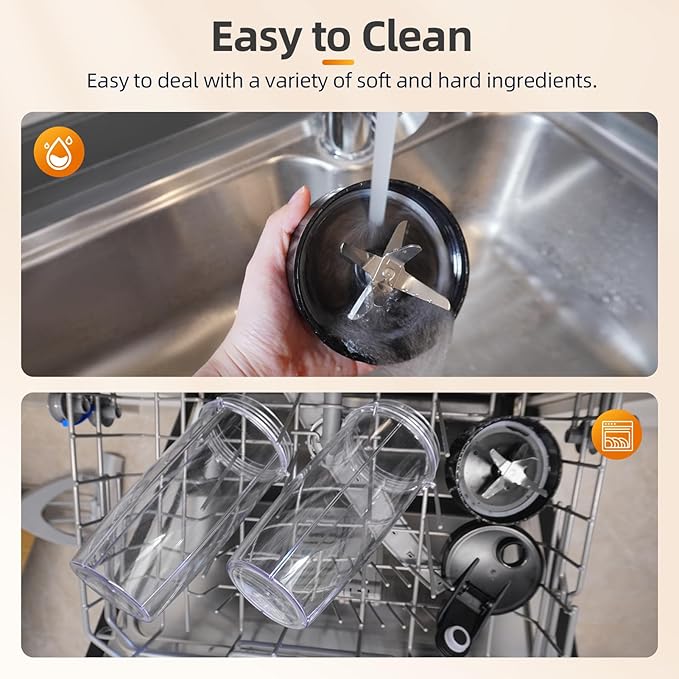 - 【EASY-TO-CLEAN】This portable blender for smoothies simply twist off the blades, rinse with soap and water. It also can be easily cleaned in a dishwasher, except for the motor part.