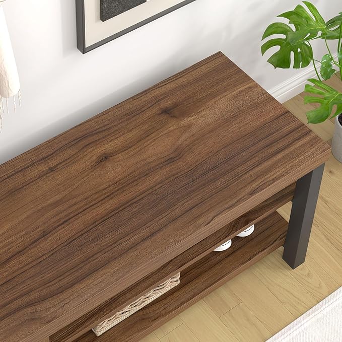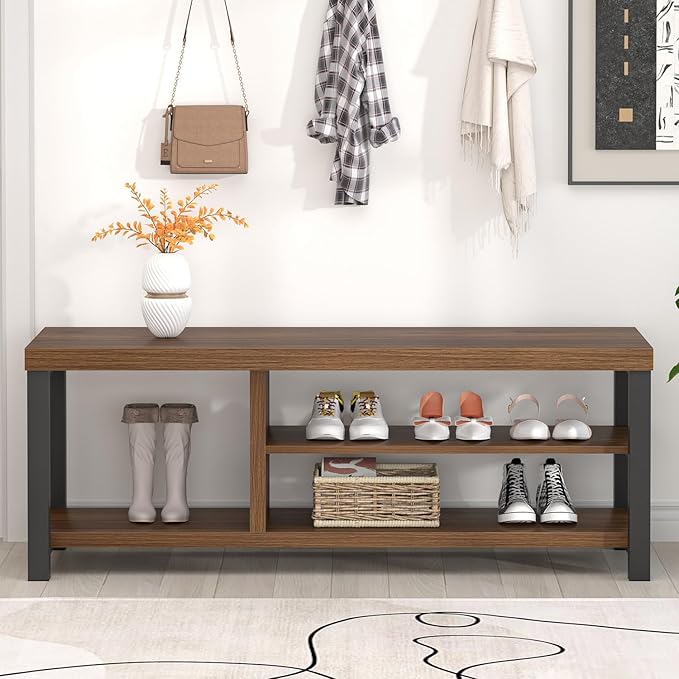 - Modern Storage Bench: This shoe rack bench combines a rustic walnut wood grain finish with a black metal frame, bringing an vintage and contemporary style to your entryway, hallway, front door, entrance. The shoe bench with storage adds rustic charm and serves perfectly as both an entry shoe rack and a bedroom bench.