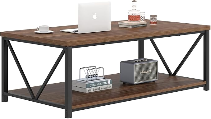FOLUBAN Modern Coffee Table, Wood and Metal Center Table with Storage, Industrial Cocktail Table for Living Room, Rustic Walnut, 47 Inch